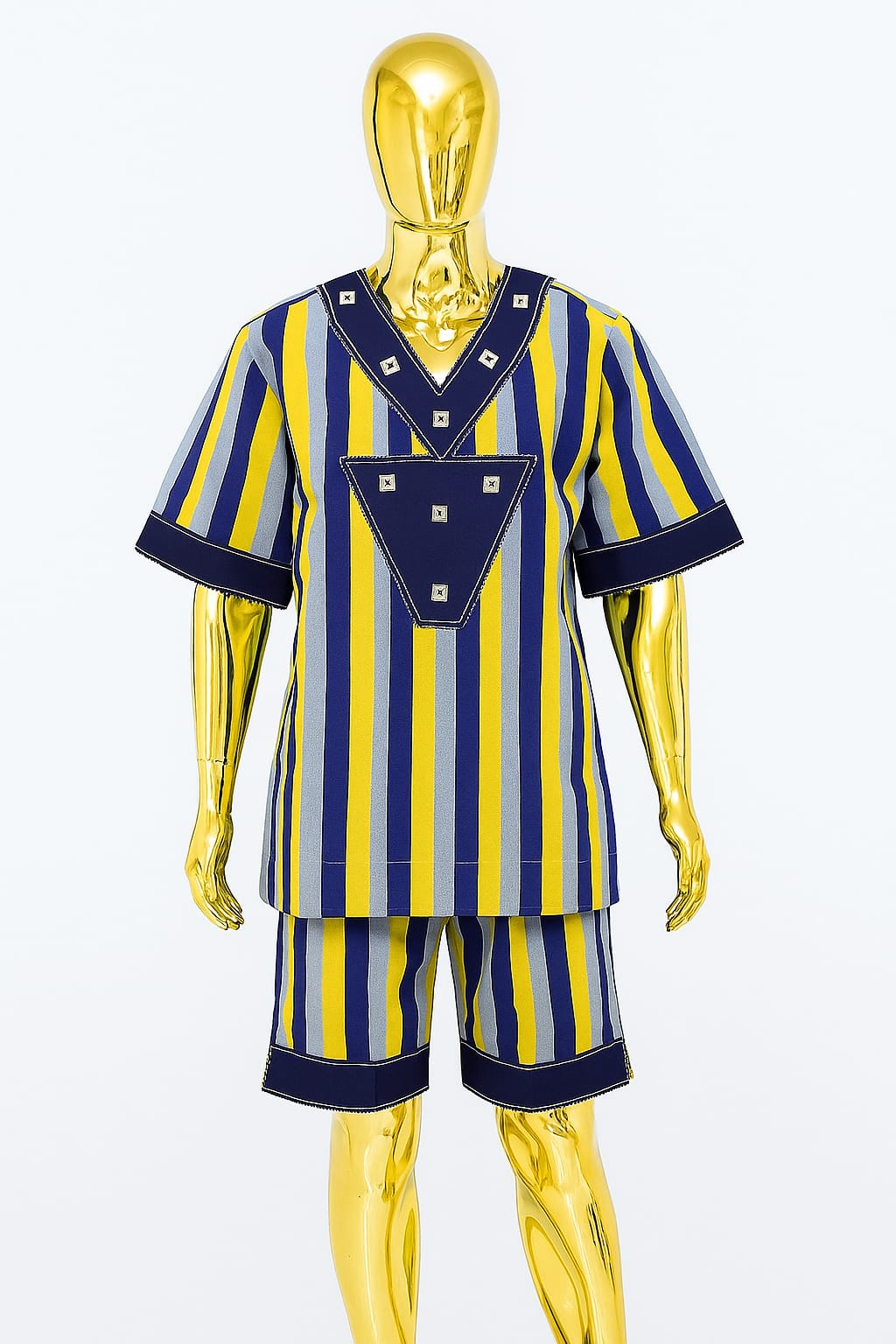 This elegant traditional men’s outfit features a vibrant mix of navy blue, yellow, and grey vertical stripes. The short-sleeve top is accented with a bold triangular chest panel adorned with decorative silver studs, giving it a regal and modern touch. Paired with matching knee-length shorts, this two-piece set offers both comfort and sophistication, perfect for cultural events, celebrations, or casual wear. Crafted from premium cotton fabric, it combines authentic African style with contemporary design for a standout look.